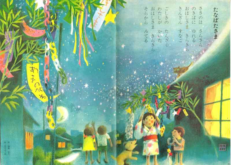 【昭和三十六年発行の絵本は「たなばた」】 昭和三十六年発行の絵本「講談社の絵本ゴールド版 童謡画集(5)」(講談社)掲載のタイトルは「たなばた」で、楽譜は「♩=112」「ト長調」「四分の二拍子」となっています。詩 林柳波 と書いてあります。 下總皖一は、昭和三十七年七月八日に亡くなりました。何も書き残していないのでタイトルを「たなばた」に変更した理由がわかっていません。