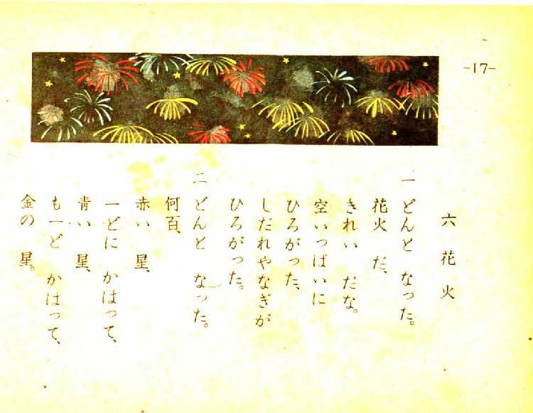 【初出】 ・第四期の『小學國語讀本 尋常科用 巻三』(文部省)昭和九年(1934年)発行に掲載されている[国定国語教科書 参照]。 ・第五期の国語『よみかた 三』にも、掲載(十七 花火 昭和十六年三月七日発行)がある。 詩には句読点がある。一連は「きれい だ。」二連は「何十、何百、」と書いてある。