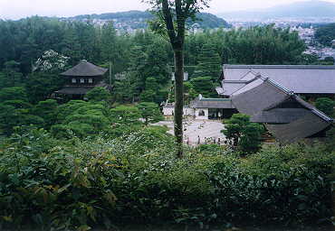 話を元に戻そう。竜安寺を出た私だが、歩いていける所にめぼしい観光スポットがなかったので、バスに乗って慈照寺に行く事にした。直接慈照寺まで行っても良かったのだが、京大を見たかったので途中のバス停で降りて歩く。途中かの有名な鴨川(一級河川)を渡る。水遊びに多くの人が集まっていた。で、京大ですが、なんだかたくさん看板が立っていました。件の新キャンパスの建設に反対する学生達の仕業らしい。どうでもいいけど。キャンパスの周りには多くの学生向けの店があり楽しかった。本屋にもばーっと哲学書、学術書コーナーがあったりして、さすが京大って感じ。本屋では何も買わなかったが、シサム工房という民族モノのお店でカリンバと陶器製の太鼓を購入。東京で同様の物を買うより割安(と言っても二割安くらいだけど)。ミニ・シタールとかケーナもあったのだが、どうせ弾(吹)けないので買わず。いい店だからみなさんも京都に行った際はぜひ、シサム工房を訪れてみませう。(後にこのシサム工房について、シサムとは武蔵−ムサシ−のアナグラムではないかという説が、豊作会某氏から発表されたが真偽のほどは定かではない……ちなみに店長の実家は東京らしい。)
