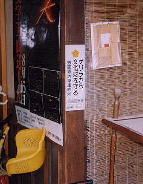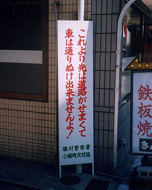 二条には観光スポットがあまりなく、二条城という城があるくらいである。その城は徳川最後の将軍慶喜が大政奉還を行ったという結構由緒ある城らしいのだが、貧相だったので見学しない事に決定。ひまなので、城の周りを歩きまわる。本屋を見つけ、入ってみる。品揃えはほとんど東京と同じ。吉田秋生の「ラヴァーズ・キス」(名作!)が文庫版になっていたので、なんとなく購入。レコード屋を見つけ、入ってみる。品揃えはほとんど東京と同じ。何も買わず。ちなみにこの間ずっとエイフェックスツインのアンビエントワークスUを聞いてた。この後もしばらく二条の町を探索し、変な看板を発見 したりしているうちに四時になったので宿に行く。