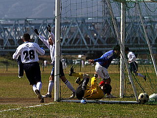| 前半終盤にG到着。(伊藤・知識・柏木の得点で3点リード中とのこと)西湘はペナ内へ引いた相手に、柏木や雄二がミドルを狙うも相手MFに阻まれ、追加点を奪えずにハーフタイムとなる。 後半、柏木・雄二がペナ内でドリブル突破を図るも最後の壁を突破できない。相手も点を奪いに攻勢に移り、自陣右サイドでフリーの24番に打たれるも、GK吉野がファインセーブで防ぎ、9番の絶妙ヘッドもGK吉野のファインセーブで事無きをえる。西湘も前掛かりになった相手DF背後に抜け出した知識がシュートを放つものの決まらない。しかし、後半11分、伊藤のカーブのかかったCKを、石塚が頭でコースを変え待望の追加点をあげる。その後も、伊藤のDF背後へのフィードや宮下への大きなサイドチャンジなど、多彩なゲームメークにより、西湘の攻撃リズムで試合が展開され、石塚や雄二・知識などがシュートを放つも決まらない。(サイドチャンジで宮下がフリーとなった後、宮下を基点にどうやって得点するか、2列目・3列目のセンスと運動量次第かな?)。終盤、GK吉野が負傷し、柏木が臨時GKとなる。最後に相手ミドルが柏木の手をかすめて決まってしまうがしょうがない。その後間もなくタイムアップとなる。 | |||||||||||||||||||||||||||||||||||||||||||||||||||||||||||||||||||||||||||||||||