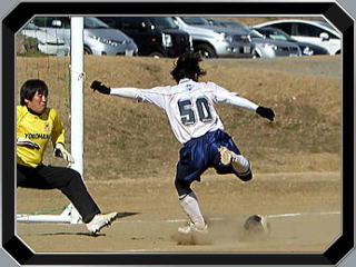 | 試合開始から横浜のハイプレッシャーの中、ポゼッションが低下し、上手く攻撃が組み立てられない。そして、ついにヘッドで先制点を奪われる。その後、横浜の運動量が徐々に落ち始めるが、太の奮闘も虚しくアタッキングサードまで中々持ち込めず前半を終了する。 後半3分、太のミドルのこぼれ球を、茂樹がゴール前で粘り同点弾を決め、5分には幸正のスルーパスから知識が落ち着いて決め逆転する(”フリーだ!落ちついて”というナイスアシストの声が有りました)。後半から入った幸正が上手くフィットし、中盤でのボール奮奪や中盤のスペースに入って、前の基点となることで、サイドへの展開・ボール回し等が上手く機能しだす。これが落ちた横浜の体力をさらに消耗させる。19分、茂樹が独走で試合を決める3点目を決め、20分、知識のラストパスから明彦がダメ押しの4点目を決める。終わってみれば前半と打って変わった完勝でした。 天王山の横浜戦を3点差の勝利でマスターズのリベンジを果たすとともに、昨夜、横浜に1対2で負けた五十チームの仇をとって頂きました。 | ||||||||||||||||||||||||||||||||||||||||||||||||||||||||||||||||||||||||||||||||