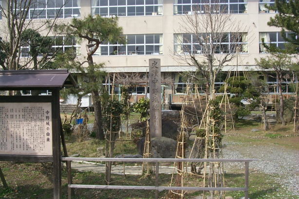 中野城跡の小学校敷地内に建つ碑と看板