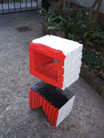 2006年11月武蔵野市民の森「自然体験館」で行われたワークショップにおいて東京高等専門学校の裏山〔八王子市椚田町)で伐採された椚やブナを素材にして作品を作った。雑木林に自生するこれらの落葉樹は樗櫟散木(ちょれきさんぼく)といって「樗」は おうち、「櫟」は「椚(くぬぎ)」のことで、ともに材木としては狂いがひどく、昔は「役に立たない木」とされていたそうだが、日本の里山に多く見られるこれらの雑木は炭木や椎茸のホダ木などに使用され、私たちには身近で親しみやすい樹木のようである。作品に開いた穴は「椚田の杜」を流れる風が通りぬけていく「風紋の窓」。 「椚の風紋」は〔青梅アートプログラム2006 緑化する感性ー街道を読むー〕の間伐材を使ったワークショップ(NPO法人アート農園主催)のなかで制作された。作品は東京工業高等専門学校内に展示されている。 |