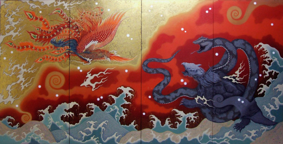 | 四神・玄武鳳凰図 1400×2800mm 和紙に顔料、膠、アクリル、墨、銅箔、金箔 2010年 | ||
