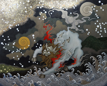 白澤図 1303×1620mm 和紙に顔料、膠、アクリル、墨、黒箔、金箔、水銀箔、プラチナ箔 2014年 |