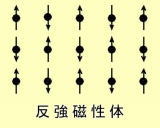 原子が磁気モーメントを持っているだけでは強磁性になりません。強磁性体は右図に示すように、個々の原子の磁気モーメントが同じ方向に整列し全体として大きな磁気モーメントを持った状態なのです。(このようにして生じた結晶全体の磁化を自発磁化とよびます。)このような状態が実現するためには、原子の磁気モーメント間に互いに平行になろうとする強い力が働く必要があります。この力は原子磁石間に働く磁気力(この力は弱くて強磁性の原因になりません)ではなく、交換相互作用と呼ばれる量子力学的な力です。この力が弱いと、熱エネルギーのため室温では個々の磁気モーメントがバラバラな方向を向き、全体としては磁気モーメントを持ちません。このような状態を常磁性体と呼びます(下図左)。その他、隣同士を逆方向に向かせる力が働く場合もあり、下図中央のような反強磁性体となることもあります。反強磁性体的な配列で、上向きモーメントの大きさと下向きモーメントの大きさが異なるとき、モーメントが打ち消されず、全体として大きな磁気モーメントをもつ物質があります。これを、フェリ磁性体といいます。実際上は強磁性体と同じで、フェライト磁石と呼ばれる磁気材料はフェリ磁性体です。上の例で、マグヘマイト(γ-Fe2O3) はフェリ磁性体で、ヘマタイト(α-Fe2O3)は反強磁性体です。