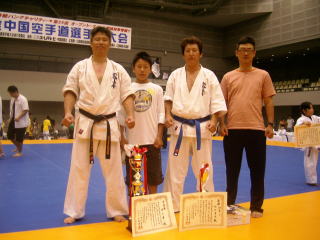 8月30日に第26回全中国空手道選手権大会が広島市で開催され当道場より2名が出場しました。中学2・3年の部に出場した井上康太選手は初戦積極的に技を繰り出し攻め込みますが、小柄ながら動きの良い相手選手の上段蹴りをもらい敗退、壮年A出場の松田多生選手は順調に勝ち進みましたが決勝でパワフルな対戦相手の攻撃に押され敗退、準優勝となりました。まだまだ両選手ともに十分力を発揮していません。今後の活躍に期待します。