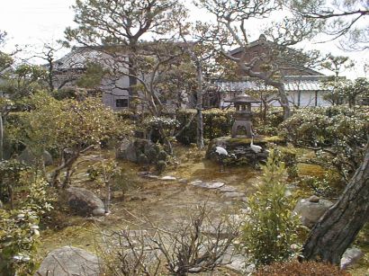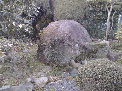 川端邸の庭。母屋側から南を見る。灯篭の右は、「樫の木」。川端の作品「父母への手紙」に描かれる。