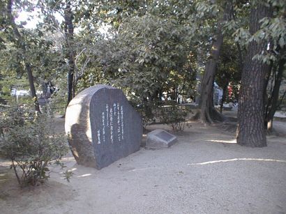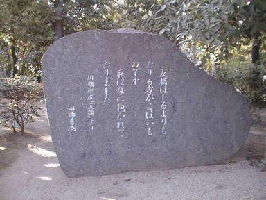 文学碑。この背後に「反橋」があるが、木々に隠れて見えない。