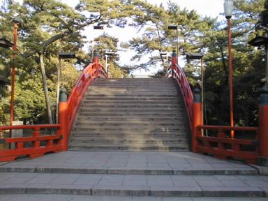 南海電鉄「住吉大社駅」で下車して、神社に向かうと、鳥居の向こうに大きな反橋(そりはし)が目につく。