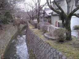 川の右岸、木の左に石碑が見える。その右が「哲学の道」。