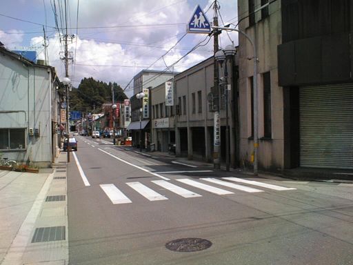 道路の左が魚屋さん。その斜め向かい(右)が生家跡。(能都町)