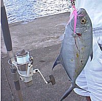 | 最終日は朝5時に、用意してもらった弁当持参で神湊港へ行った。風が強くやりにくかったが、ジグでナンヨウカイワリをキャッチした。釣友はダツ・エソなど。八丈では堤防からでも20キロオーバーのヒラマサなどが釣れる。大型狙いにTIFAのSTANDING ROCK・11ftを持参したが、今回は磯・堤防ともにベイトフィッシュが少なく、大型魚が寄っている感じは無かった。台風で止めたが、夜釣りのほうが釣れているそうだ。 |