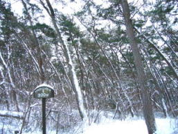 写真33 今日の小径探索を終了し、55番地点 の三叉路までもどってくると案内板の後には白 い雪が広がっている。ここにはクロマツが少な いので、空中に松の枝がないからだ。 15:00:42 |