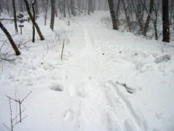 写真2 三叉路を左のコースをとると、50mに 1カ所間隔で目印の棒が立ち、除雪されていた。 |