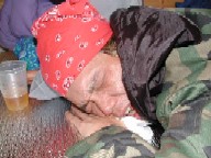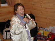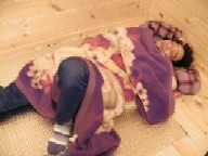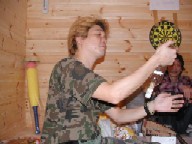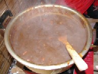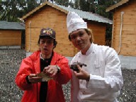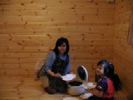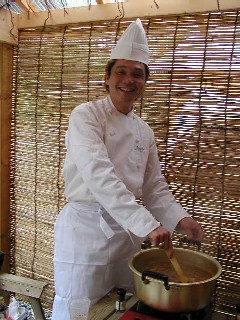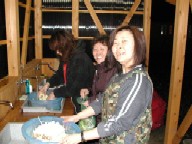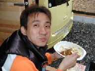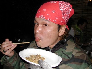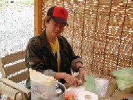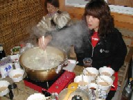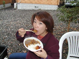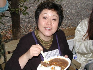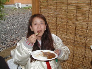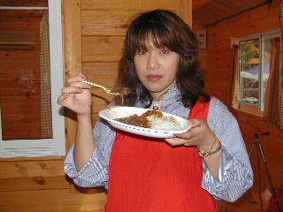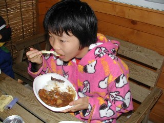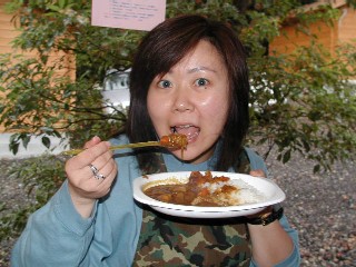“くず坊カレー”出来上がりぃ〜 お皿を持って並んでねっ! あのぉ〜ちょっと格好と鍋が 不釣合いじゃありませんかぁ〜? |