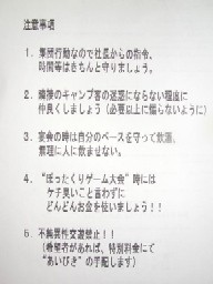 参加者全員に配られた タイムスケジュールと注意事項 |