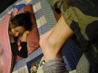 マキちゃんっ! 起きないと遊ばれちゃうよっ! この臭そうな汚い足・・だれっ? |