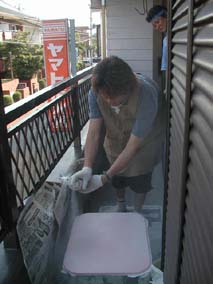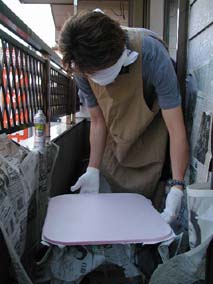 | お得意のペンキ塗り。 ピンクのテーブルを sugiyanマジックで白に・・ ほらっ。。上手いだろ? スプレーにはコツがあるんだよ。 素人には難しいねっ♪ |