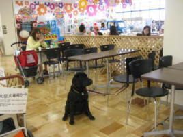 monetの社交性のトレーニングに、犬同伴okのホームセンターのレストラン・エリアに