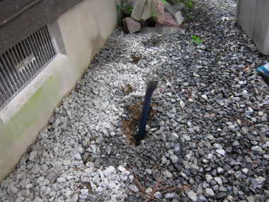 ・・・・・しかし、下部には要壁の水はけ用の砂利が入っていて掘り進めない。