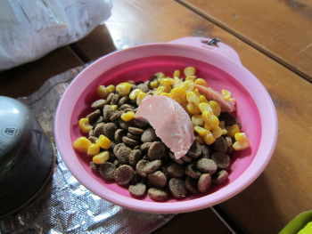 monet は、お湯でふやかしたドックフード、私はフリーズドライ・チキンラス、グリーンカレーヌードル
