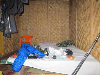 手前のトタンに藁葺き小屋は、ガイドやポーターが一晩中、薪を燃やし