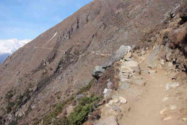 右斜面の上部に線に見えるのがPhortse(ポルツェ)に向かう登山道・・・・ ナムチェから登ってくるルートは