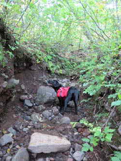 狭い岩場にリックが引っかかる・・・ 火山岩は石英が含まれているので