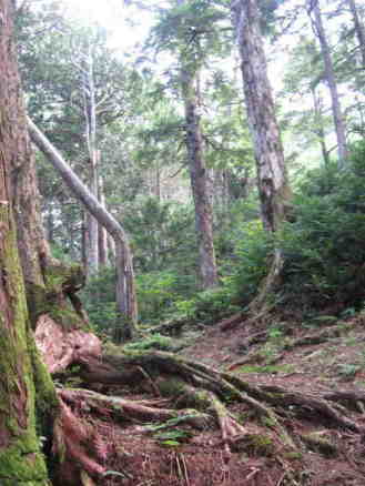 13:18 下山開始・・・・ 這い松の低樹木帯を下りて行く
