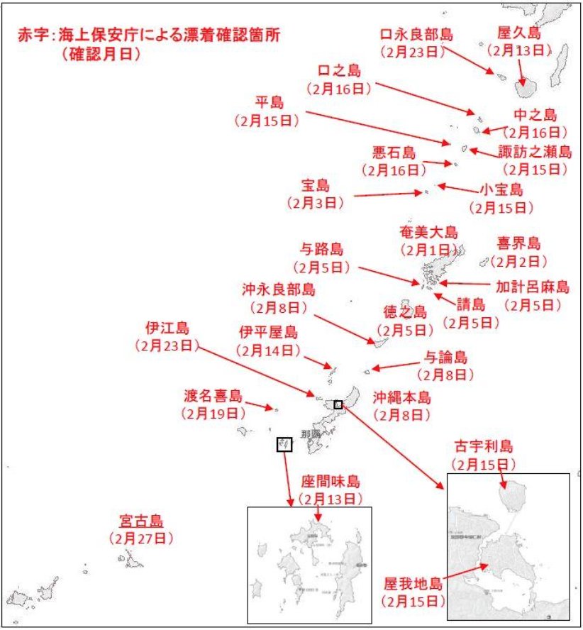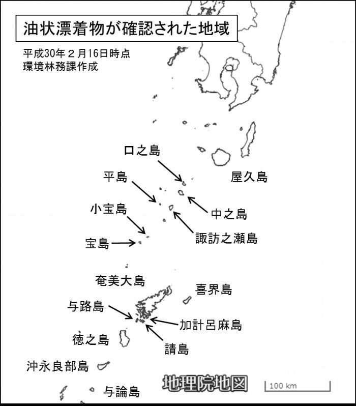 2018年2月16日 鹿児島県HP ○油状漂着物が確認された地域 口之島,中之島,諏訪之瀬島,平島,小宝島,宝島,屋久島,奄美大島,喜界島,加計呂麻島,請島,与路島,徳之島,沖永良部島,与論島pic.twitter.com/735tSZ62c9