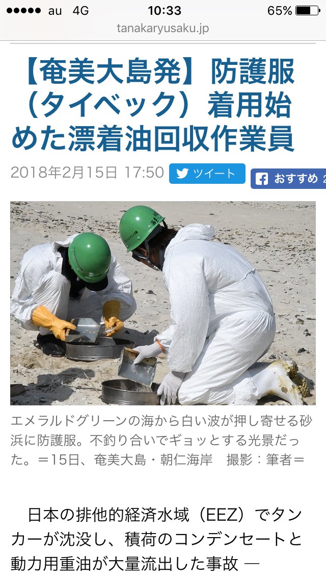 田中龍作ジャーナル | 【奄美大島発】防護服(タイベック)着用始めた漂着油回収作業員 http://tanakaryusaku.jp/2018/02/00017558 …