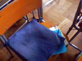 そして机の中に入らなかったプリントは椅子につけてある座布団の下にはさんでいるのです。