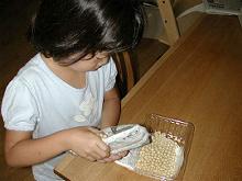 大豆を100gはかります。 はかりの上にパックをおいてから目もりを0にあわせてはかった。 |