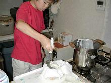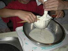 | 70度に温め固まるのを待ちます。 固まってきたら木のわくにうつします。 木のわくにはぬのをひいておきます。 |