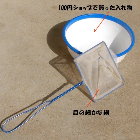 管理用として稚魚が逃げない目の細かな網と入れ物も用意しましょう! |