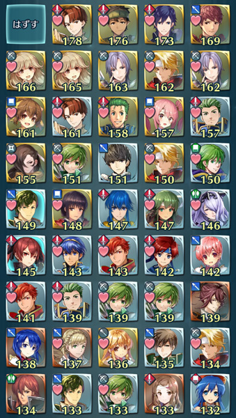 以下わが軍の能力値合計によるソート。上位はレベル40。