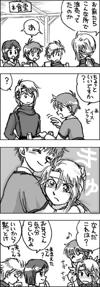 小ネタTOPにもどる ■約束 雪景色のなか出迎えてくれた師匠は、笑いながらぼくの頭についた雪を払ってくれた。 「久しぶりだな。ちゃんと鍛練は続けていたか?」 「はい! あの……ありがとうございます。色々とお骨折り頂いて」 「冬に会うと約束したからな。それにお前は俺の弟子なんだろう」 「あなたの名に傷をつけないよう、がんばります!」 「ここでは俺の名なんて悪名でしかない。気にせず国と自分のために腕を磨いていけ」 その言葉にも嘘はなかったのだということは、すぐに知ることになったのだけど……。 ■添い寝 騎士団の宿舎の食堂で夕食をとっていると、寝支度を終えたら部屋に来るようにと師匠に声を掛けられた。 数刻の後、こんな夜更けに何の用事だろうと訝りつつも部屋を訪ねると、寝台にいる師匠は、だるそうに手招きする。近寄ると腕を引かれ、寝台に引っ張り込まれた。 「お前ここで寝ろ」 「は? ここでって……いっしょにですか?」 「狭くはないだろう」 「そういう問題じゃありません!」 なんとか抜け出そうともがくものの、圧し掛かられ身動きができない。 「ひとつ毛布にくるまって寝た仲じゃないか」 「あれは寒冷地での行軍中のことでしょう? いい大人がふざけないで下さい」 師匠は、ふうと息をつき、真面目な顔になる。 「正直に言おう……実は少々困ったことになっていて……」 「はい」 「最近不眠症気味でな……なかなか寝付けないんだ……どうにも人肌が恋しくて」 「……は?」 「少し前に宿舎を抜け出しての夜遊びがバレて夜間外出禁止になってな……それならばと、ご婦人を招待したら、目敏い舎監に見つかって大目玉をくらって……」 「……その代わりにぼくに添い寝しろと?」 心底脱力してしまった。食堂で周りの視線が気になったが、こういうことだったとは。 「そうやって誰彼構わず寝床に引っ張り込んでいるわけですか?」 「失礼なことを言うな。これでも好みは煩い方だぞ」 それこそ、そういう問題じゃないんだけどなあ……。 「夜伽をしろとまでは言わないから」 「当たり前です! ……分かりました。いいですよ。不眠症ではお仕事にも障りますからね」 「それでこそ俺の愛弟子だ」 ぎゅっと抱きしめられると、きれいな顔が間近に迫り、照れてしまう。それにしても、ひとりだと眠れないなんて、この人はこんななりをして子どもみたいなところがあるんだなあ。 ……と思っていたら、いつの間にか襟元が開けられ、胸元に唇の柔らかな感触が……。 「や……っ……ちょっと待ってください!」 「ああ、すまん。こんな体勢でいると、つい……」 「やっぱり考え直していいですか?」 襟を合わせるように掴み慌てて逃れようとするが、簡単に押さえ込まれてしまい敵わない。じゃあこれならどうだ、と背後から抱きしめられた。自分をすっぽり包む温かな腕が心地よく、どぎまぎしてしまう。 「これなら……いいですよ」 「毎晩ちゃんと来いよ」 「毎晩!?」 自分の師匠がこんな甘えん坊さんだとは知りませんでしたよ、とぼやくと、美人の師匠と添い寝できるなんて役得じゃないか、と返された。 ■光射す庭 その瞬間は、今も瞼に焼き付いている。 晴れた昼下がりだった。王妃殿下の護衛ということで師匠とぼくは連れ立って王宮の中庭に向かった。 光あふれ花の咲き乱れる温室で侍女と楽しげに談笑している美しい王妃殿下。傍らに佇む女騎士は微笑みをたたえ、それを見守っている。その光景を見、一瞬目を細めた師の表情──。 それだけで、分かってしまった。これはこの人の一番大切なものなのだと。大貴族としての矜持でも騎士としての誇りでもなく、自分自身の心からの望みとして、命に代えても護ろうとしているものなのだと。 妃殿下の御前に跪き護衛の交代を告げると、女騎士は礼をして退出していった。それまで彼女のいた場所に立ち、ぼくは姿勢を正して大きく呼吸した。 この穏やかなひとときを護るのだと、心に誓って。 ■たったひとつの この人のことが好きなのだと そう気付いたら ただ嬉しかった まっすぐな道が見えるから 苦しくても 辛くても それでも 歩いて行こうと決めた 「俺には愛だの恋だのはよく分からん……」 あなたの口癖 ぼくを煙に巻き牽制するためか それとも自分でも気付いていないのか 想いは確かにあなたの中にあるのに きっとあなたにとって ただひとつの真実 それを護るため力になりたいと思った できることなら あなたの傍らで ■スミレの花束 滞在中に充てられた部屋の扉の前に立つと、中から人の話し声がした。下働きの人が清掃でもしているのだろうか。 軽くノックをして、返事を待たずに扉を開けたぼくの目に入ったのは……師匠が見知らぬ少年に口づけしている場面だった。 ぼくの存在に気付いても二人は特に悪びれもせず、笑顔で挨拶をかわし、少年は固まったままのぼくの横をすり抜けて出て行った。 「悪いが部屋を貸してもらった。俺の部屋では人目につくからな」 「な