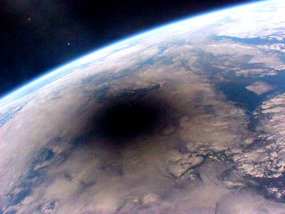 皆既日食の皆既中の瞬間、 宇宙から地球を見るとどーなるか?という 実に教科書的な感動的な写真です。 ロシアのミールに乗船していたフランス人パイロットが、 フランスに落ちる月の影を撮影したものだそうです。