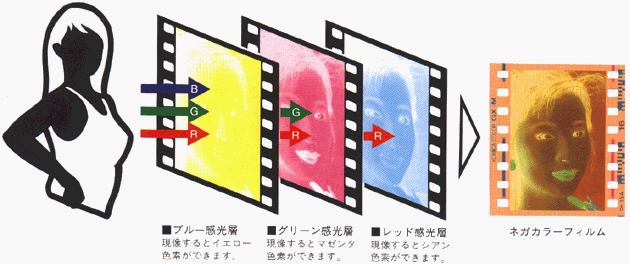 これをカラーフィルムでは上から、青感層、緑感層、赤感層と並べて、