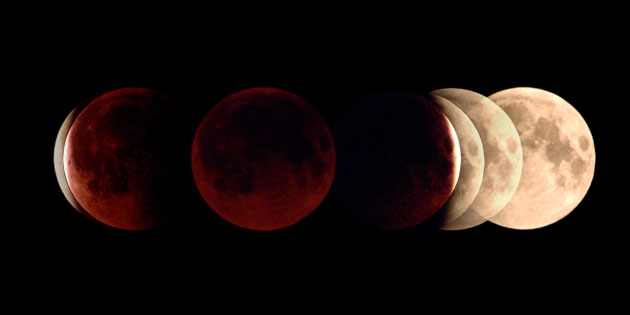 月食の各過程の写真を並べると月が横切った「地球の影」が浮かび上がります。