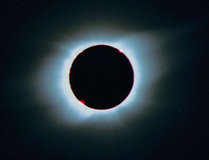 黒い太陽の周りをふちどる深紅のプロミネンス。