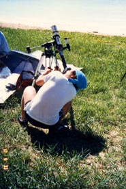 | 観測の準備に余念がない、 若き日のKuroです。 拡大撮影用のフローライトと ビクセンの赤道儀。 これを飛行機に持ち込むのが 実は大変でした。 |