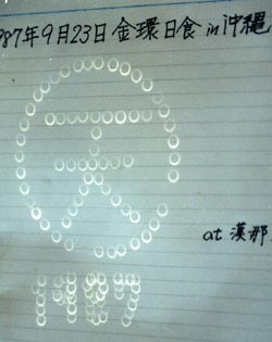 | 金環食中のもう一つのお楽しみ、 ピンホールの記念撮影。 紙に針で穴を開けて投影すると太陽の形が映ります。 当然、金環食中ならリングの形が。 サークルのシンボル?の○に天の字と、 1987の針穴文字が、愛らしいリングの文字となりました。 ちなみに木漏れ日も全てリングですから、 ちょっとメルヘンチック? |