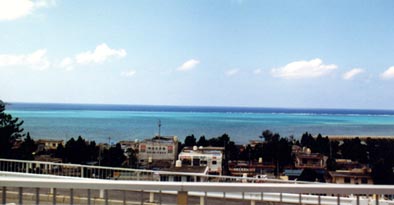 観測予定地の食の中心付近に位置する 「漢那ビーチ」へ向かう途中。 前日の大雨洪水注意報の予報はどこへ? 美しい沖縄の青空と海が 私たちを出迎えます。 |
