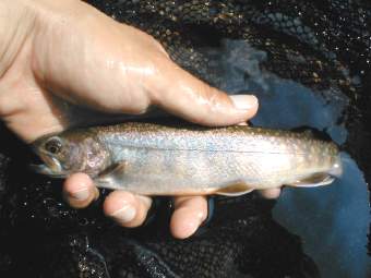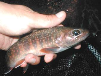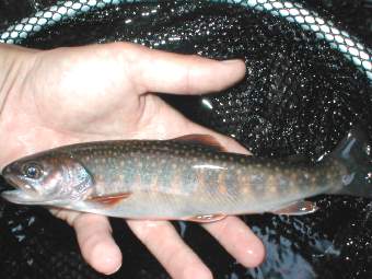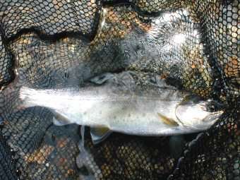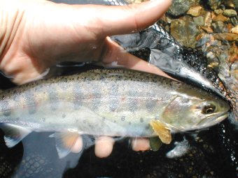 6月8日 「岩魚は赤色が好き」この真偽を確かめるべく6月8日、千代川支流T川の源 流へ釣行。T川は前回の釣行でいい思いをさせてもらった、今度はちょっと下流 部で釣ることにした。フライは赤が目立つパラシュート・レッドを使った。この パラシュートはボディがすべて赤色なので、今回の調査には最適のフライだ。入 渓して1キャストでいきなりのヒット!24センチの岩魚だ。今日は好調、幸先 いい。次のポイントでも1キャストでヒット、23センチの岩魚だ。こいつをス トマックしてみると予想通りテレストリアルを食ってる、甲虫類がでてきた。2 0分の間で5〜6匹の岩魚を全てパラシュート・レッドで釣り上げたので、調査 のため今度は黒のパラショートを使った。このフライは魚がでることにはでるの だが、出方があまり良くないので、すぐにさっきのフライに戻す。余談になる が、このような調査をしてみたのはフライの雑誌に書いてあったことと、自分の 今までの経験のよるものである。雑誌には「岩魚は赤色のはいったフライによく 反応する。」と書いてあったし、自分の経験ではニンフを使った時、岩魚はニン フではなく赤 色のインジケーターに飛びついてきたシーンを何回か見たのである。話は戻るが この後も順調に釣れ、予想以上の釣果でポイントのすべてに岩魚がついていてま さにバホバホ状態のウハウハである、笑いが止まらなかった。特にすごかったの は最後のポイント。そこは魚止めの堤防ポイントで、ここはまさに岩魚が湧いて でてきた。キャストすれば必ず釣れるという状態でここだけで5〜6匹キャッチ した。合わせ切れを何度したことか。この日はビッグサイズこそは釣れなかった が、20〜25センチの岩魚が20匹以上釣れてまさに最高!の1日だった。