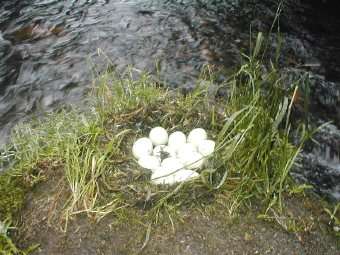 7月25日 お気に入りのH川へ釣行。H川はいつも安定した釣果を望める。H 川の源流域はまだ行ったことがないので、そこでの釣行。H川の源流域は森の保 護区域らしく、ブナの原生林が多く残されていて、川の渓相、透明度ともに最 高!期待に胸がふくらむ。今日も狙いは尺イワナ、絵になるようなやつが釣りた い。入渓してすぐ魚をゲットすることができたが、20センチたらずのイワナ。 気を取り直しフライをエルク・ヘア・カディス#10をチョイス。これくらいで かいフライを使えば、小さいやつはこないし、でかいやつのみ狙うことができ る、という思惑でのチョイスである。この考えが功を奏したのか、でかくはない が、20〜24くらいのイワナがあきない程度に遊んでくれた。そしてある小さ なプールに着いたときのことである。流れもほとんどなく、魚が隠れるような目 立った岩もない。こんなとこにはいないだろうと、投げやりな気持ちでキャスト する。フライがゆっくり流れ、そろそろピックアップしようかと思った瞬間、バ シャ!大きな水しぶきがあがった。驚いてあわせるがフライが空を舞った。目を 凝らしてみると尺はあろうイワナが目の前にいるではないか。再度フライを流す がイワナは二度とでてくれなかった。「クソッ!ちゃんと食っていれば。」と思 っても後の祭り。しかもこのあとアクシデント発生!顔の周りをブンブンとうっ とおしい虫がまとわりつくので、ハッカスプレーを頬と額にかけた。その時誤っ て目の周りにハッカがかかったらしく「うぎゃーーー!」激痛が走った。しかし これで虫は寄ってこないだろうと思ったが、まだブンブンくる。こいつらにハッ カはきかないらしい。この日は虫との格闘が多かった気がする。次の日の26日 にもH川にきて、昨日よりもちょっと下流でやったがでかいやつはでてこなかっ た。あの川にはまだまだでかいやつがどこかに潜んでいるはずだ。