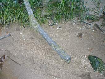 7月28日 この日は**ダムがある*川への釣行。この川にはブラウンがいる と店長に教えてもらって大きな期待を胸にバイクを飛ばす。しかしそんな期待と はうらはらに魚たちのご機嫌はわるかったようだ。フライを打てども打てども魚 の反応は悪い。ほとんど抜かれたのか?と思っていると、先行者の足跡を発見。 まだ新しい。すぐさま移動。移動途中で一人のフライマンと遭遇、どうやら足跡 の犯人はこのおっちゃんのようだ。お決まりの「釣れますか?」の問いに「20 くらいのしか釣れない」と返ってきた。話によると、6時半からずっと釣りあが ってきたが、でかいのはまったくと、不満そうな表情を浮かべていた。もうちょ い上流でやってはみるものの、おっちゃんの言葉どうりくるのは小さなやつばか り、ブラウンのブの字もでなかった。あきらめて別の川に移動するとき、この日 最大のイベントが起こった。それはちょうど峠をこえたあたりのことだった、右 カーブを曲がったところで50メートル前方の道路の脇の原っぱで黒い動く物体 を発見!すぐ熊だとわかった。熊もこっちの存在に気づいてこちらを見ている。 僕はあわててデジカメを取り出そうとしたが、バイクのエンジン音にびっくりし たのか、一目散に逃げていった。僕は自分でも恐ろしいくらい冷静になってい て、熊の画像を撮ろうとしたくらいだ。初めての熊との遭遇で、僕の第一印象は 「熊(ツキノワグマ)ってけっこうかわいいな」だ。何年か前、北海道の熊牧場 でヒグマを見たせいか、ヒグマとツキノワグマを比較してしまって、ツキノワグ マがかわいくみえてしまうのかもしれない。ストリームで買った熊よけ鈴が頼も しく思えたが、絶対に手放せないなというビビリ面も隠せなかった。魚はぜんぜ んだったが、貴重な体験をした一日だった。画像は鹿?の足跡。