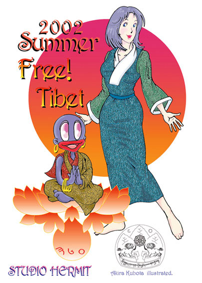 西暦2002年、夏のご挨拶のイラストです。 この年の六月は北インド地方へ行きました。 目的はチベット亡命政府がある「ダラムサラ」です。 チベットでは、60という数字に意味があるそうです。 ちょうど、チベット政府創立360周年記念の大イベントがあり、それに参加してきました。 チベットの心のささえである猊下、 「Dalai Lama法王第14世(テンジン・ギャツオ)」に謁見することができました。 右下の山と獅子のマークは、チベットの国旗に使われるトレードマークです。
